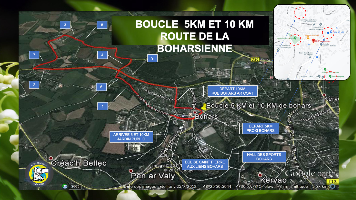 Lieu des départs : Halle des sports pour la marche, le Bourg de Bohars pour le Trail, les courses enfant et les courses des 5 km et 10km sur route.