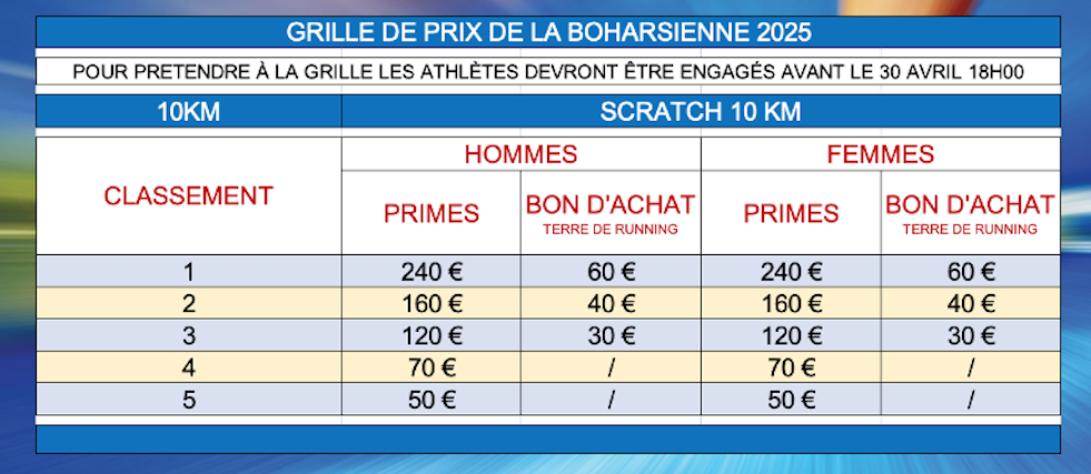 La Boharsienne regroupe pour cette édition, trois courses, dont un Trail de 15km chronométré, un 5KM et un 10KM route. Une Marche et des Courses « enfants » de benjamins à Bout’Chous sont également proposées.